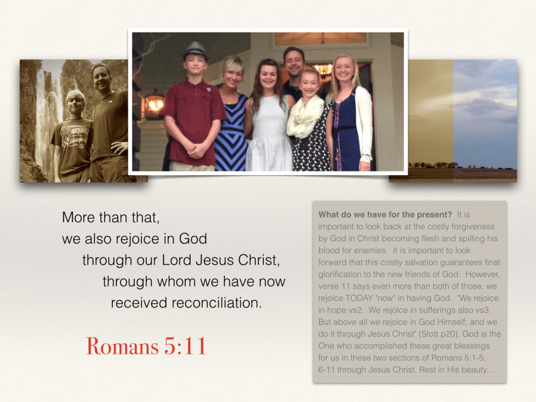 Paul’s logic is what hits me today: the past of Christ drying for me his enemy is what guarantees he will save me his friend to the uttermost. Having a valuable future of worth beyond anything money can buy transforms my present. I HAVE reconciliation with God my loving, good Father now.