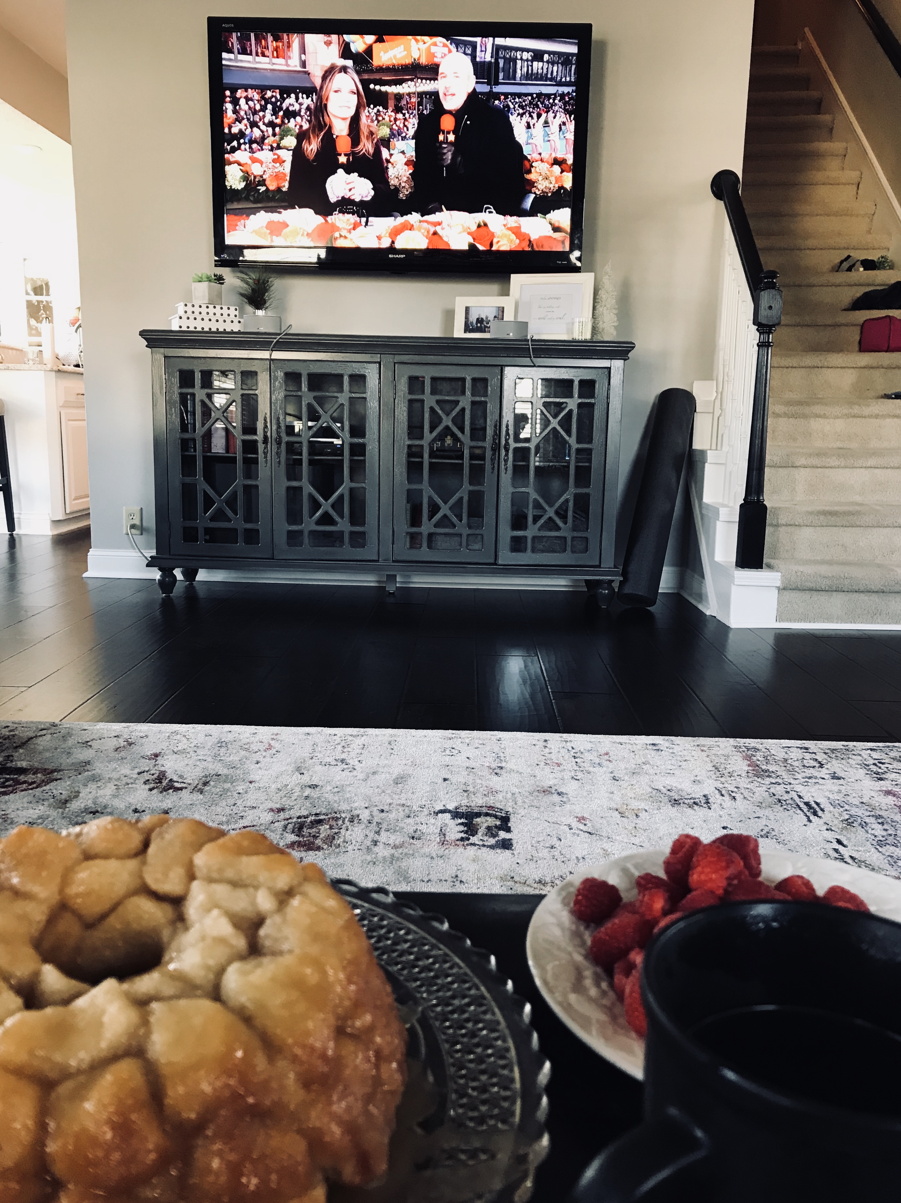 After a good turkey trot run with Justine and Turner, I have looked forward to this moment all year with monkey bread from Jodi and Grace, piping hot coffee, fresh fruit added this year, and the parade.
