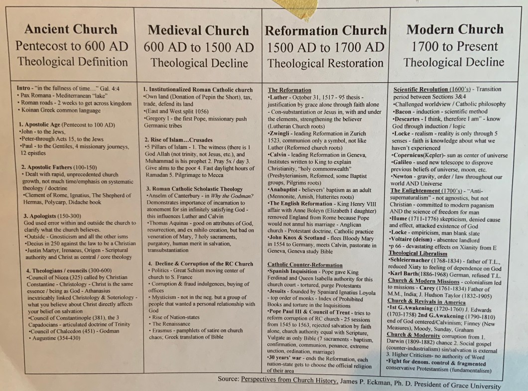 I ran across this today in going through some things in my office. Very helpful to see a quick summary and markers by which to place key events in history with what was going on in the church as well!