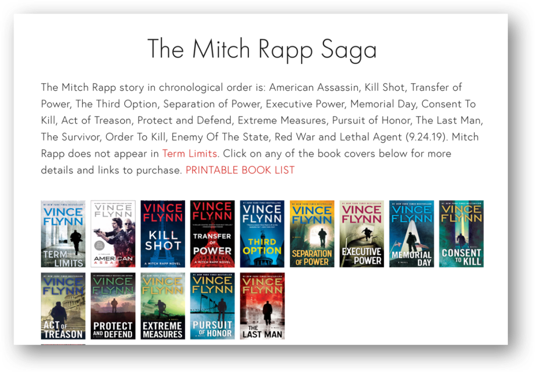 Vince Flynn’s gift as a writer set this series apart from me from other writers. He is in the Grisham category for me on visual storytelling. Hiss use of detailed dialogue, character development, narrative, and plot are exceptional and kept me coming back to read this series many times, some of these books I have completed five or more times after Jackson died.