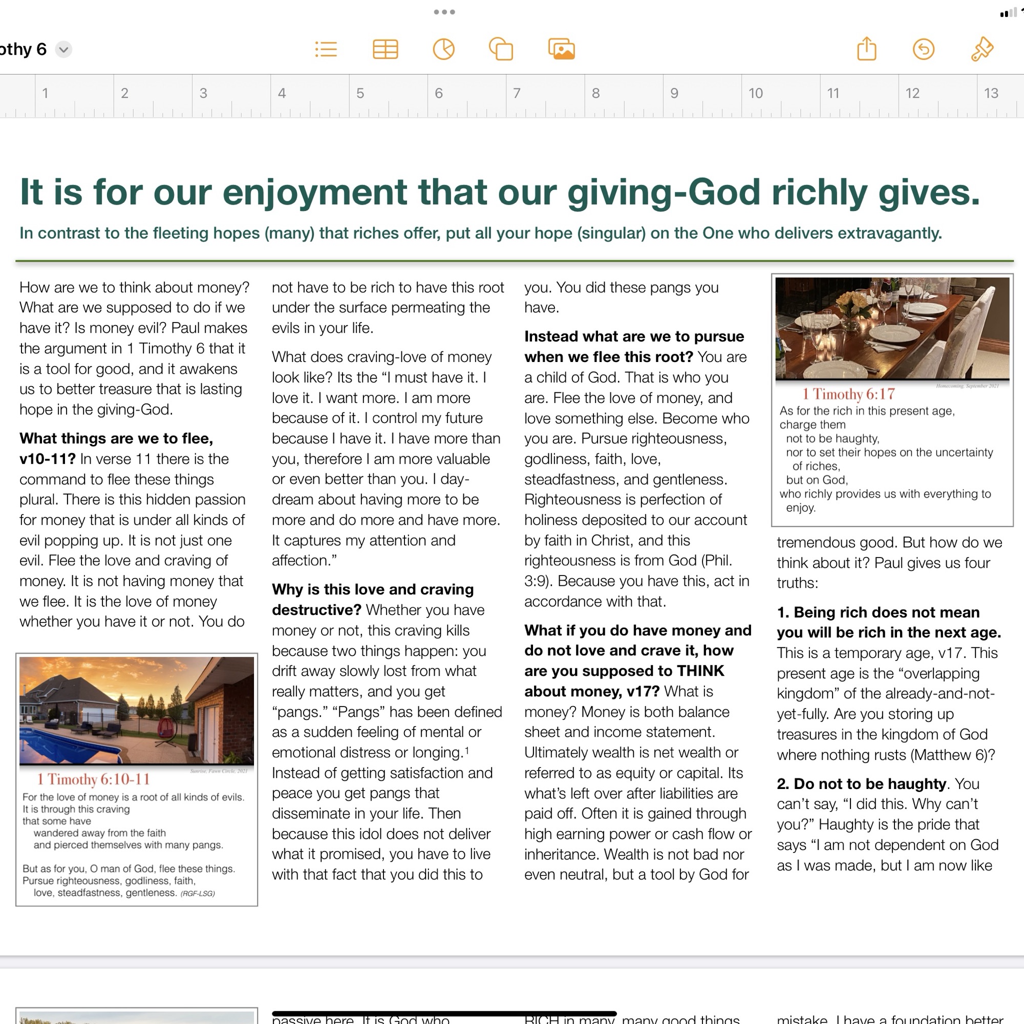 July 7, 2024July 7, 2024 Eric Blick In contrast to what money can’t deliver, Saint Paul reminds us that the generous God is a better treasure. A quick WSJ format article on a reflection on 1 Peter 6 and the trap of money vs the treasure of a well placed hope. Reflection-1 Timothy 6.pdf Share this: Click to share on Facebook (Opens in new window) Facebook Click to share on X (Opens in new window) X Like Loading... Related