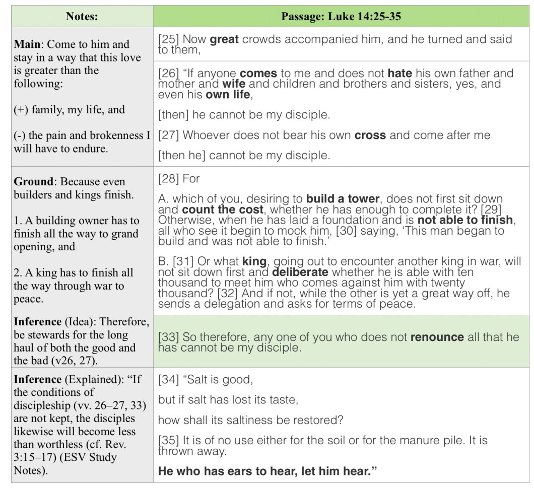 October 14, 2024October 14, 2024 Eric Blick Luke 14 – Jesus asks a large crowd of fans to count the cost if they are followers. Headline: Tasteless salt is worthless, so is a disciple who quits for unrealistic expectations. Share this: Click to share on Facebook (Opens in new window) Facebook Click to share on X (Opens in new window) X Like Loading... Related