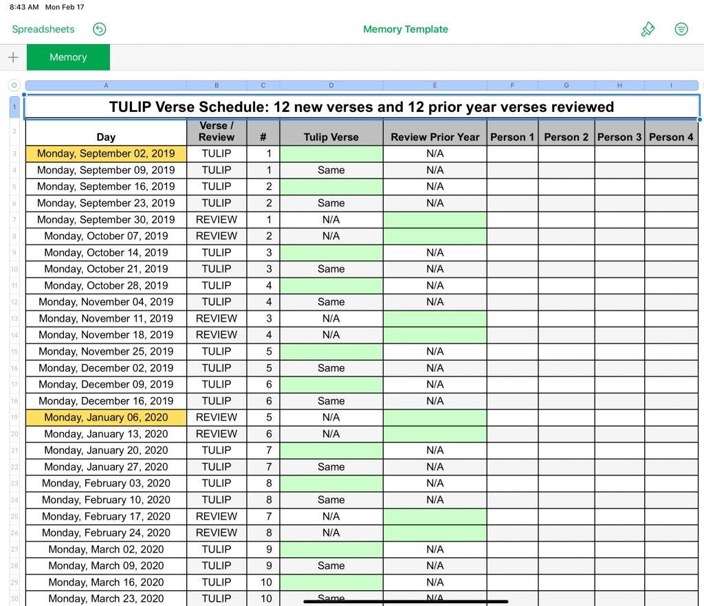 Click on the above scheduler to download a helpful template that takes 10 months or so memorizing 12 verses with other(s). Twelve may not seem like a lot over almost a year but you will be surprised how fast they add up. Then year 2 Column E becomes an important way to review, brush up on, and keep fresh the work you have done in previous year(s).